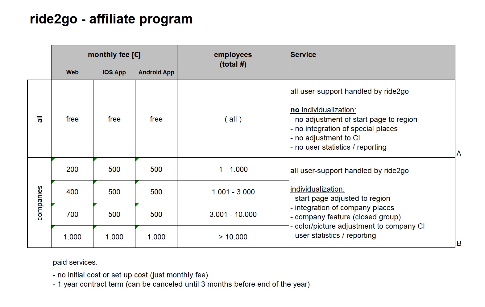 Ride2go GmbH only charges costs for operation, no set-up and/or creation costs. The contract period is 1 year (automatically extended by 1 year if not canceled up to 1 month before the end of the year). All user support is provided by Ride2go GmbH (no additional effort for the company). The system is completely free for the user.